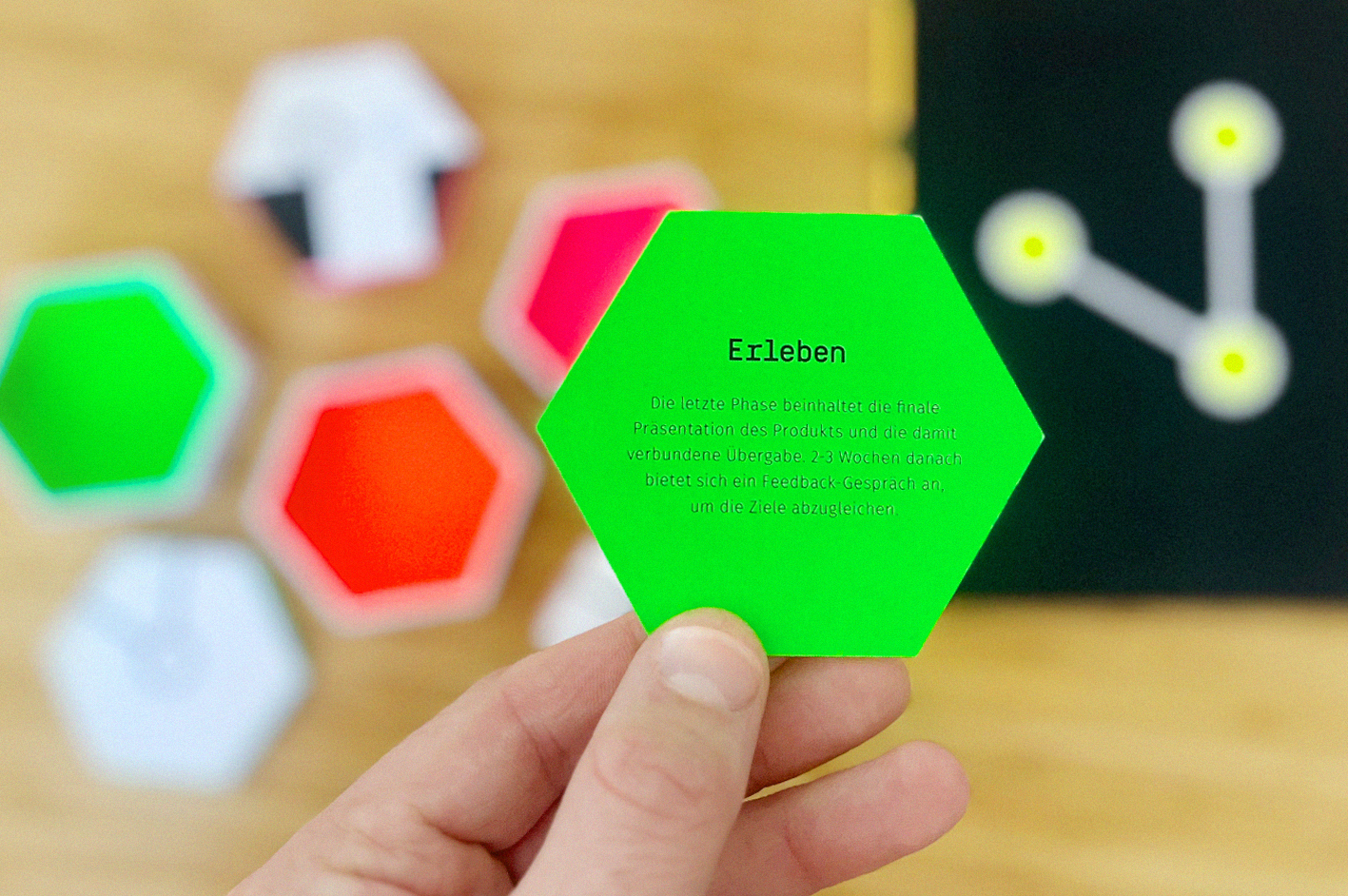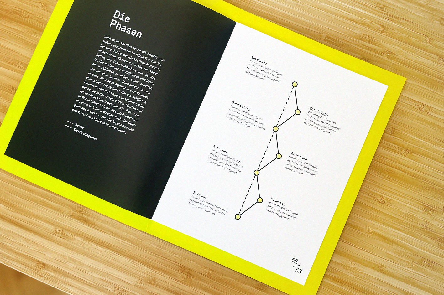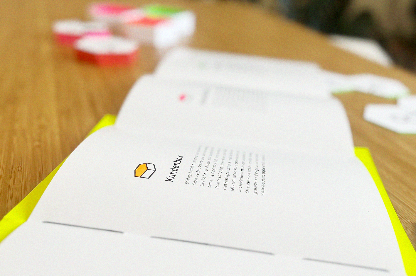 Dazu kommen mehrere interaktive Boxen, die Theorie in die Praxis übersetzen: eine für Auftraggeber:innen, die ein gutes Briefing unterstützt, eine für Agenturen, die die Projektsteuerung erleichtert, und eine für Kreative, die spielerisch und strukturiert gemeinsam mit dem Auftraggeber Lösungen entwickeln. So wird Theorie direkt anwendbar – ohne erhobenen Zeigefinger, aber mit echtem Mehrwert für alle Beteiligten.