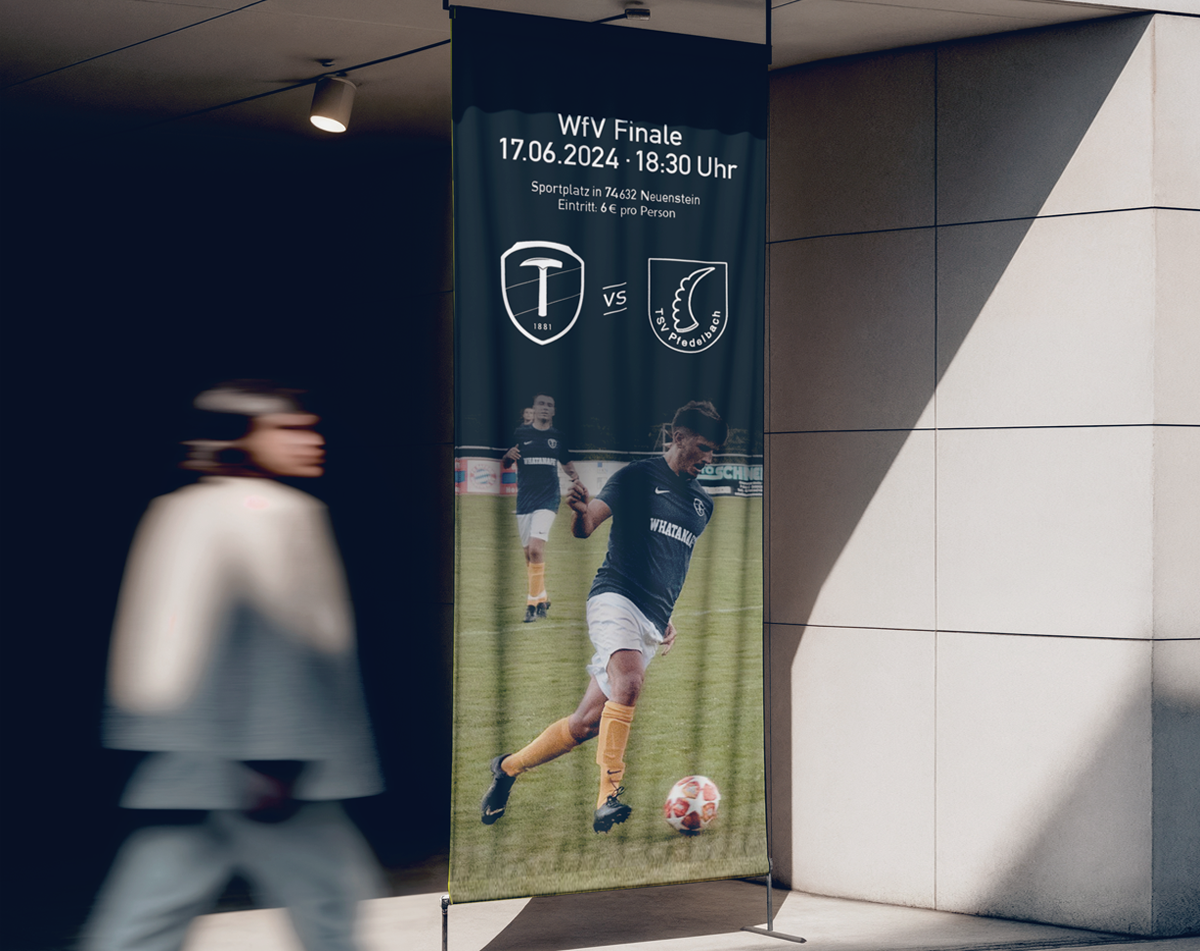 Die Wahl der Farbe Blau spielte eine zentrale Rolle im Redesign, da der Bereich Fußball innerhalb des TSV Neuenstein seit Jahren mit dieser Farbe verbunden ist. Das Fußballteam tritt traditionell in blauen Trikots auf, was diese Farbe fest in der Außendarstellung des Vereins verankert. Durch die Entscheidung für ein modernes, kräftiges Blau bleibt die Identität des Vereins als Fußballclub erhalten, während gleichzeitig ein frischer und professioneller Eindruck entsteht. Der Blau-Ton wurde mit einem lebendigen Gelb kombiniert, das die Hohenlohe-Farben aufgreift und so die Verbindung von Tradition und Moderne harmonisch unterstreicht.